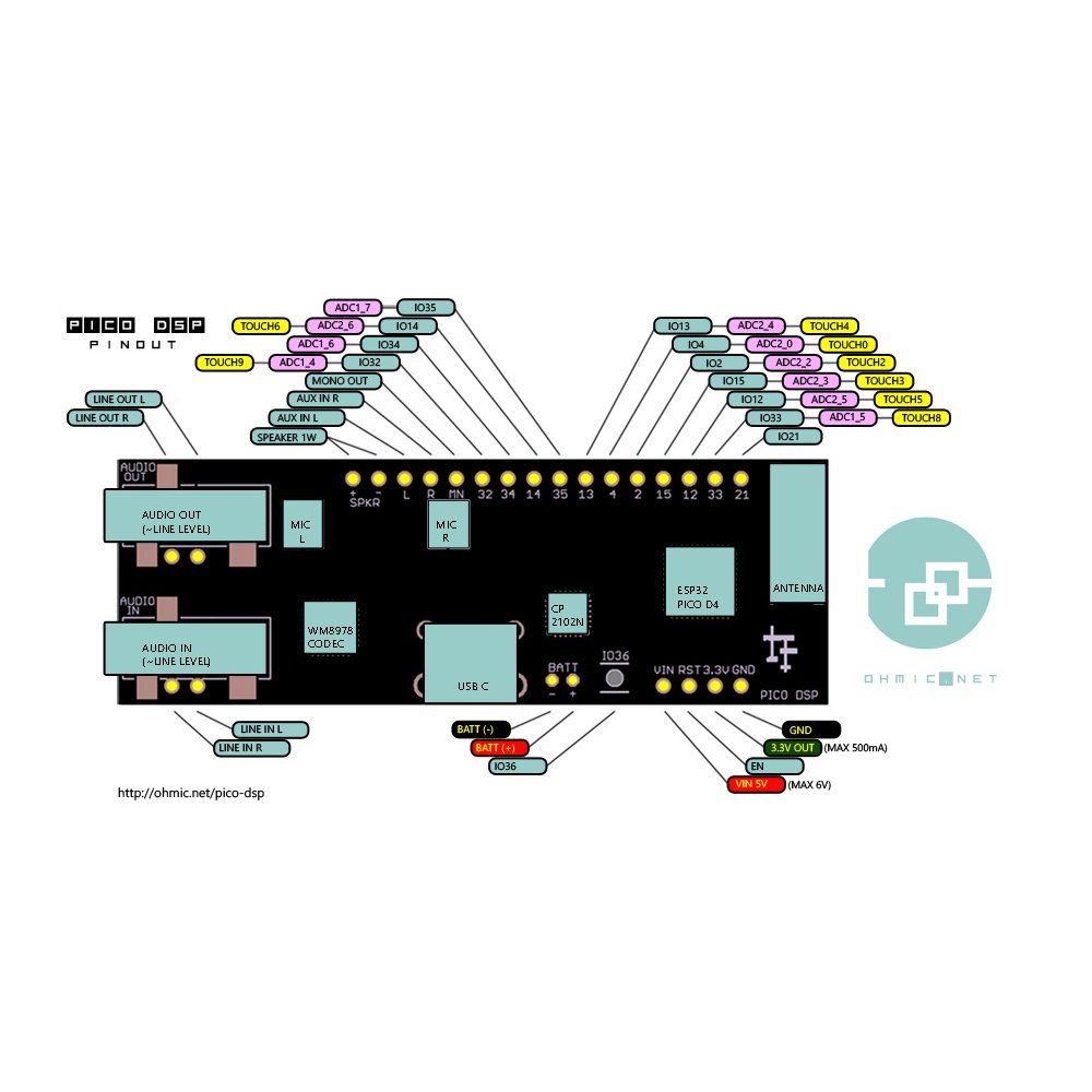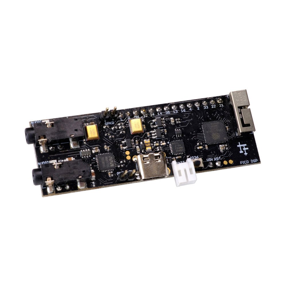 PÚCA DSP wurde für den mobilen Einsatz konzipiert. In Verbindung mit einem externen 3,7-V-Akku kann er fast überall eingesetzt oder in nahezu jedes Gerät, Instrument oder jede Installation integriert werden. Sein Design entstand aus monatelangen Experimenten mit verschiedenen ESP32-Entwicklungsboards, DAC-Breakout-Boards, ADC-Breakout-Boards, Mikrofon-Breakout-Boards und Audio-Anschluss-Breakout-Boards, und – trotz seiner geringen Größe – schafft er es, all diese Funktionen in einem einzigen Board zu vereinen. Und das ohne Kompromisse bei der Signalqualität.
